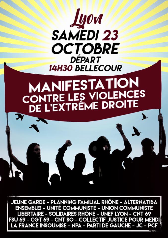 Signataires : CGT 69 / Solidaires Rhône / FSU 69 / CNT Éduc / CNT SO / UNEF / Jeune Garde / Collectif Justice pour Mehdi / Planning Famillial 69 / Alternatiba / France Insoumise / PG / UCL / NPA / UC